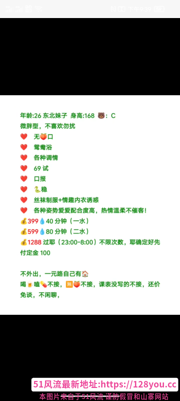 凡是有要求路费/定金/保证金/照片验证/视频验证等任何提前付费的行为,千万不要上当。同时也请注意仙人跳,在寻欢前不要露富和带过于贵重随身物品。本站为分享信息并不对寻欢经历负责,碰到有问题的信息,请及时举报给我们删除信息。部分小姐姐较为敏感,所以请在联系对方时不要透露此条信息来源。https://bz904.cc/item/206003