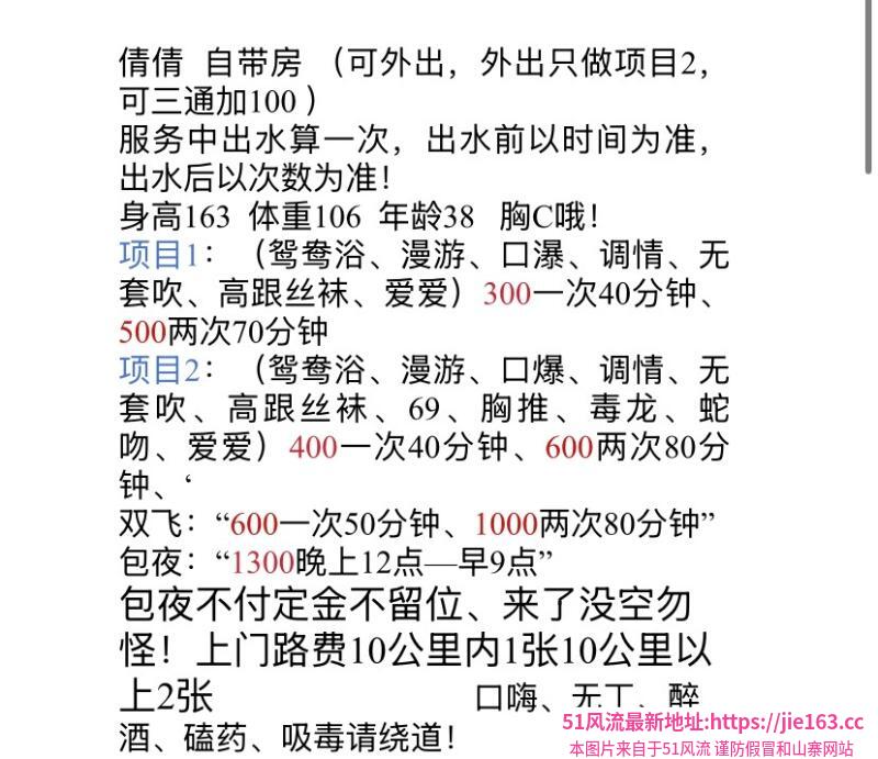 凡是有要求路费/定金/保证金/照片验证/视频验证等任何提前付费的行为,千万不要上当。同时也请注意仙人跳,在寻欢前不要露富和带过于贵重随身物品。本站为分享信息并不对寻欢经历负责,碰到有问题的信息,请及时举报给我们删除信息。部分小姐姐较为敏感,所以请在联系对方时不要透露此条信息来源。https://bz904.cc/item/212651