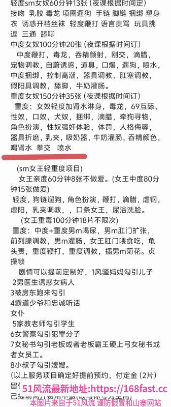 服务项目:按摩 胸推 漫游 吸皮 亲吻 毒龙 拳交 喝尿 喷水